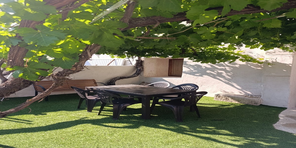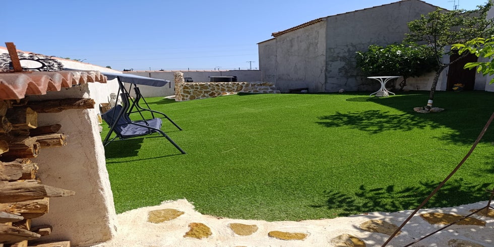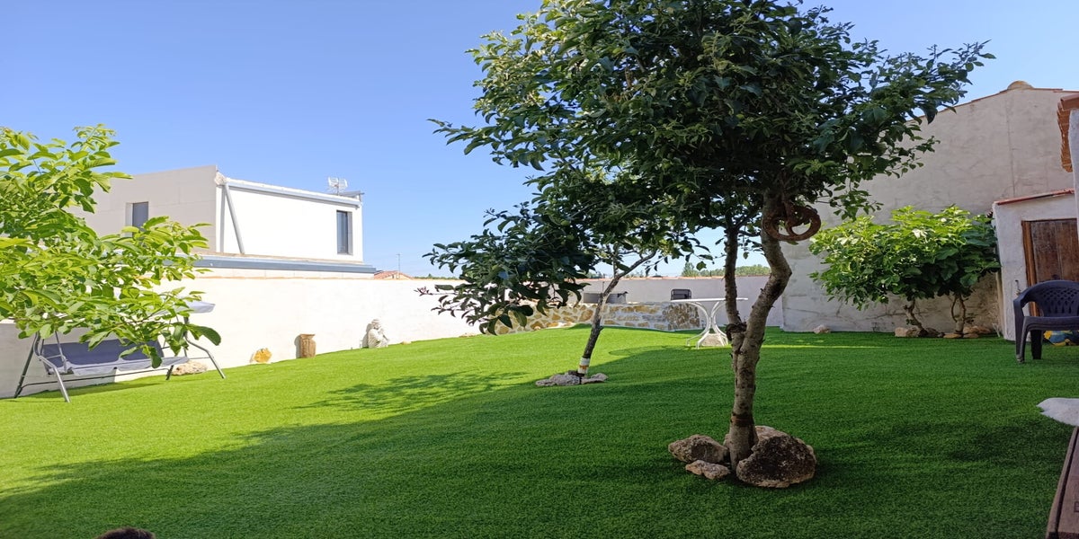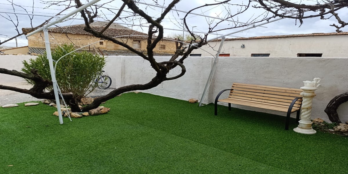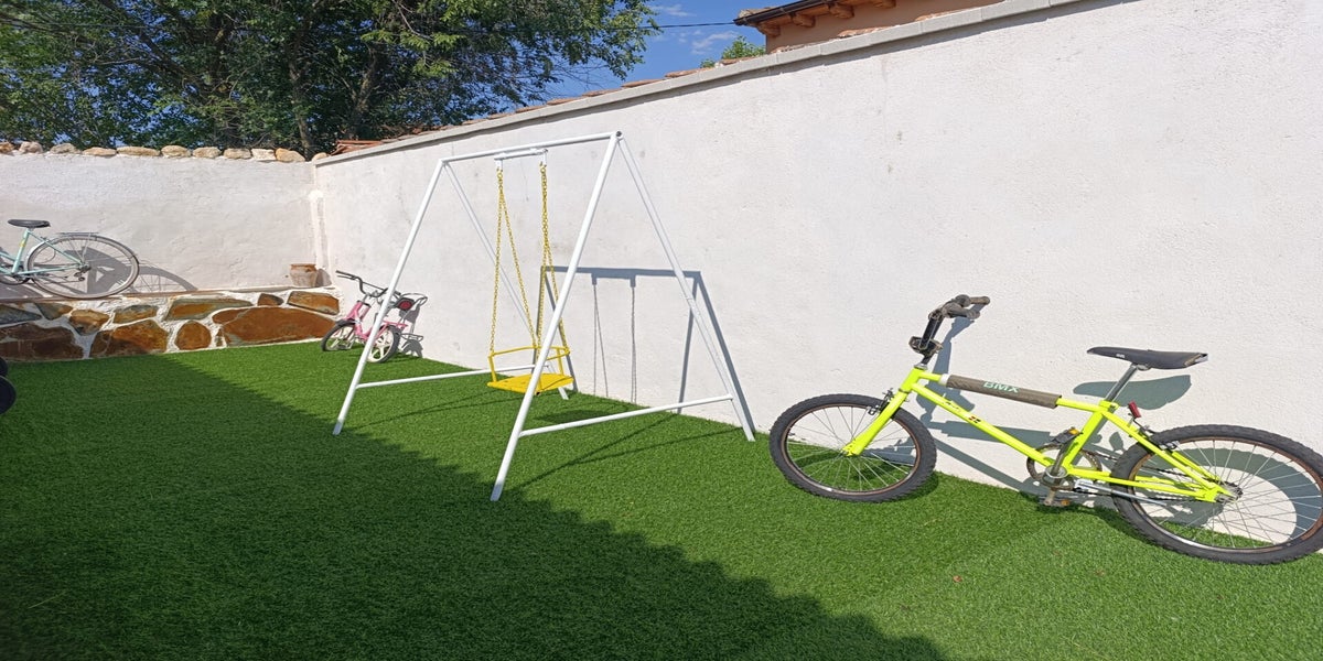 El patio trasero sin embargo, está dedicado al relax, a la desconexión y a la comodidad. Es una zona más reservada y con mayor intimidad. En el encontrarás una amplia zona de césped con asientos y balancín, mesa de recreo y nuestra peculiar therma.